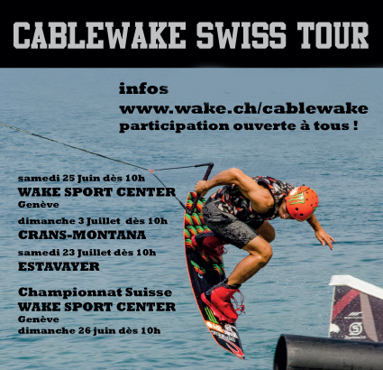 Avis aux amateurs de cablewake ! Notez les 4 dates du Cablewake Swiss Tour 2016 : samedi 25 juin (étape Wake Sport Center, Genève), dimanche 26 juin (championnat suisse 2016 Wake Sport center, Genève), dimanche 3 juillet (étape Crans-Montana), samedi 23 juillet (étape Estavayer-le-Lac). Tous les détails et modalités d'inscription seront disponibles prochainement sur ce site, rubrique "calendrier/inscriptions".