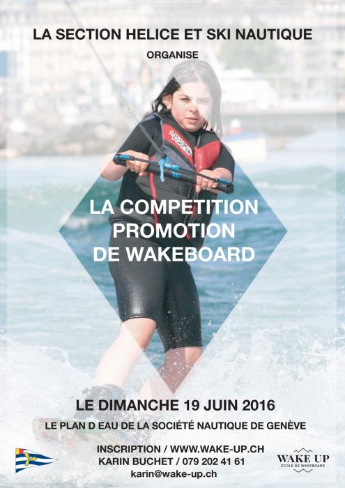 La compétition PROMO WAKEBOARD organisée par la Société Nautique de Genève et le club Wake-Up au Port Noir de Genève est reportée au samedi 3 septembre 2016 en raison de la mauvaise bise du 19 juin.