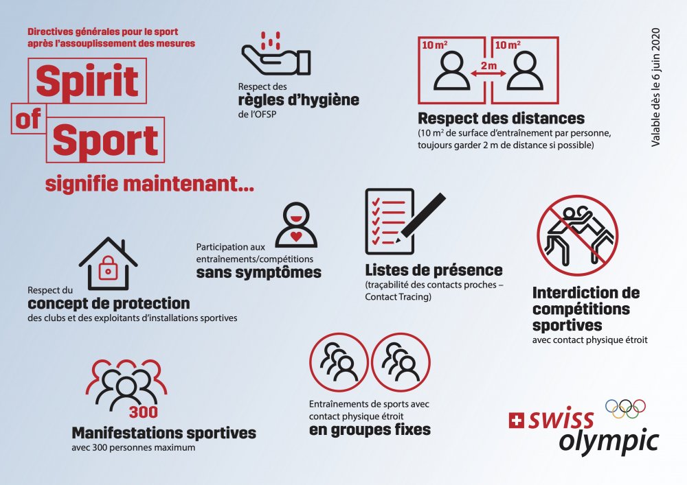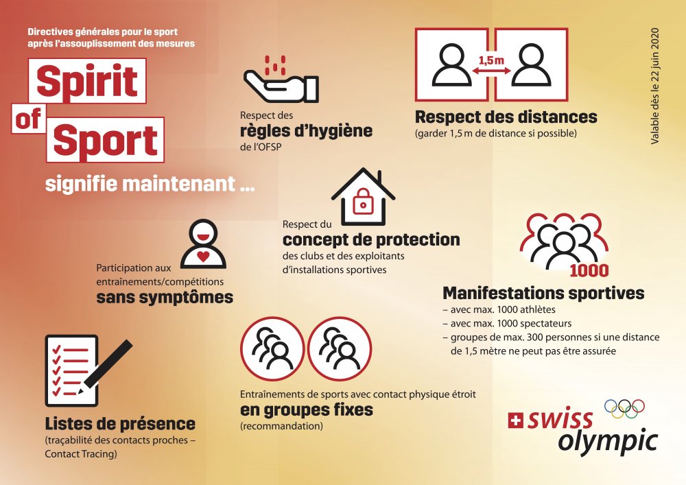 Suite aux annonces du conseil fédéral du 19 juin dernier, de nouvelles consignes sont publiées sur le site de SwissOlympic.